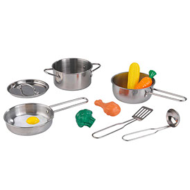 With our real metal, kid-sized KidKraft Deluxe Cookware Set with food, little chefs can pretend to cook just like Mom and Dad. This 11-piece set is built to stand up to even the most enthusiastic imaginations for years to come. With a pot, pans, utensils and play food, this set is ready to enjoy right out of the box, or with any of our kitchen playsets.