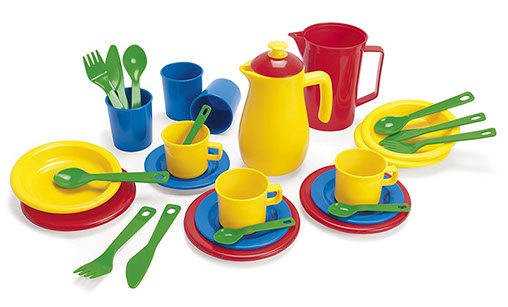 Dinner and coffee set for 3 seatings in the traditional dantoy colours. The set is perfect for both indoor and outdoor use. Don't forget to wash it before and after use.