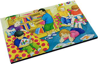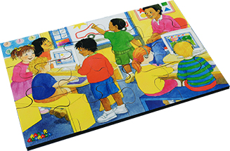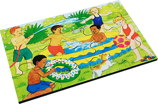 This wooden set includes 6 sets. Fun in the Kitchen, Story Time, Online Fun, Fun at the Seaside, Water Play & Fun at the Park.