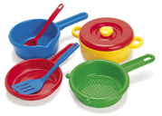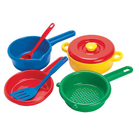 Cook delicious food with this play set. The set contains pots, a pan, a strainer and utensils.t is packed in a net. Don't forget to wash it before and after use.
