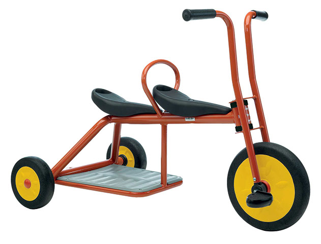 A tricycle with 2 seats, heavy steel pipe, frame and fork, no slip pedals, new long base seats and steering limits.