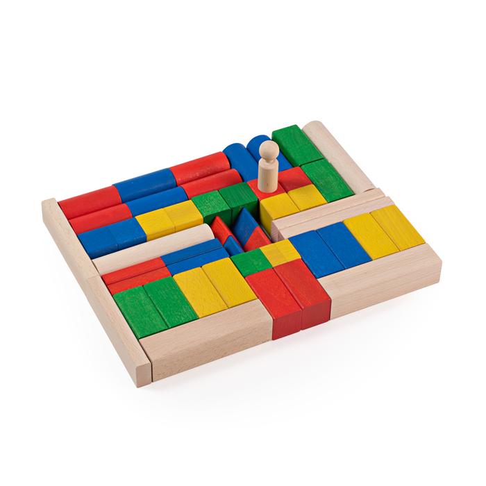 Furthermore there is the possibility to play a time based game: the winner is the one who complete the chosen subject in the shortest time. Wooden cylinders, rectangles, cubes, triangles in yellow, red, green and blue. The children learn quickly to recognize those shapes and colours. All the blocks of this building toy are easy to handle and to be put on top of each other.