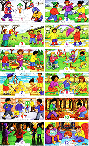 This puzzle shows the 12 months of the year. Each illustration depicts children's activities relating to the seasons, the weather and tradition.